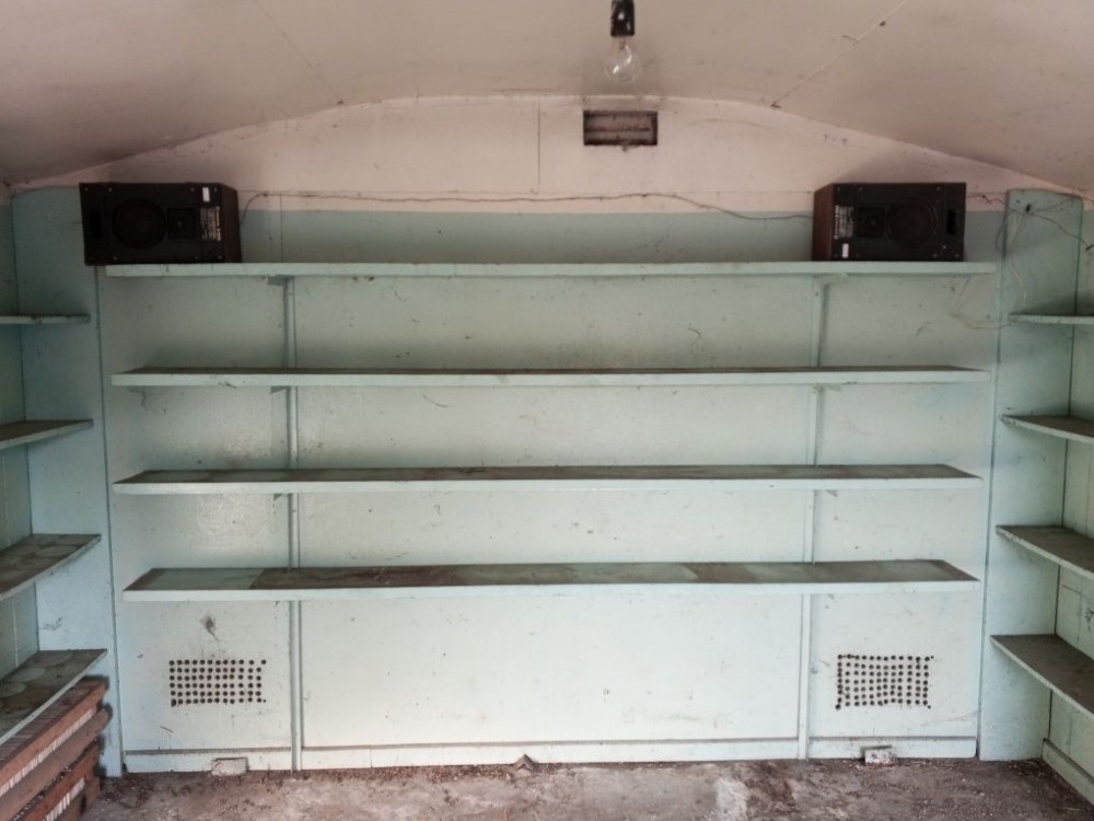 Пол бетонный, есть стеллаж и полки.