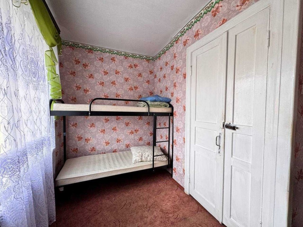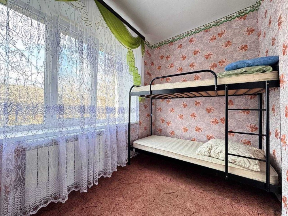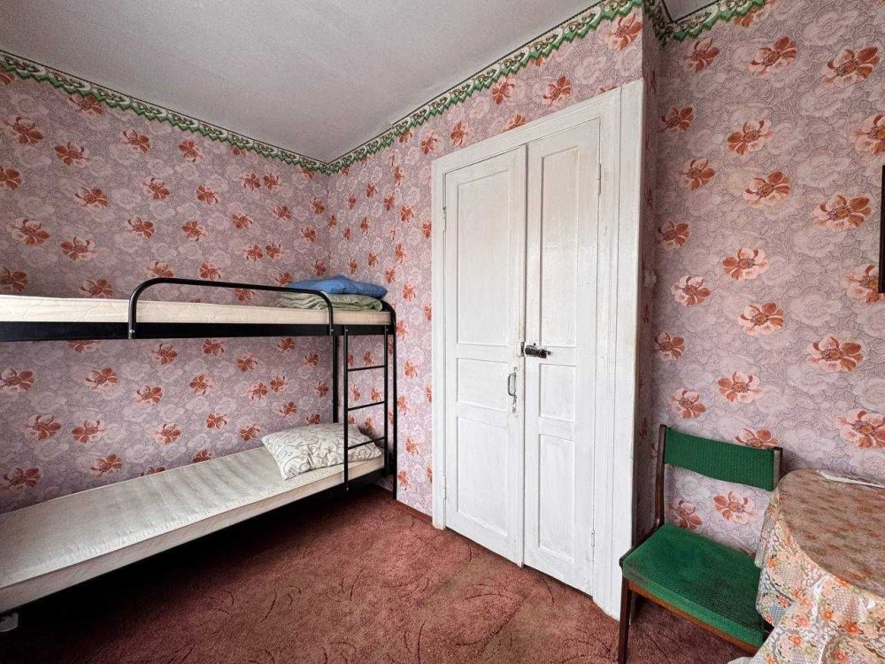 В комнате есть двуярусная кровать, шкаф, стол и стулья.