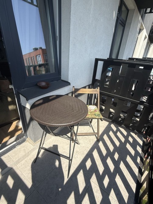 Красивая, уютная и приятная квартира для жизни и отдыха с красивым видом, особенно вечером. На балконе столик и 2 стульчика.