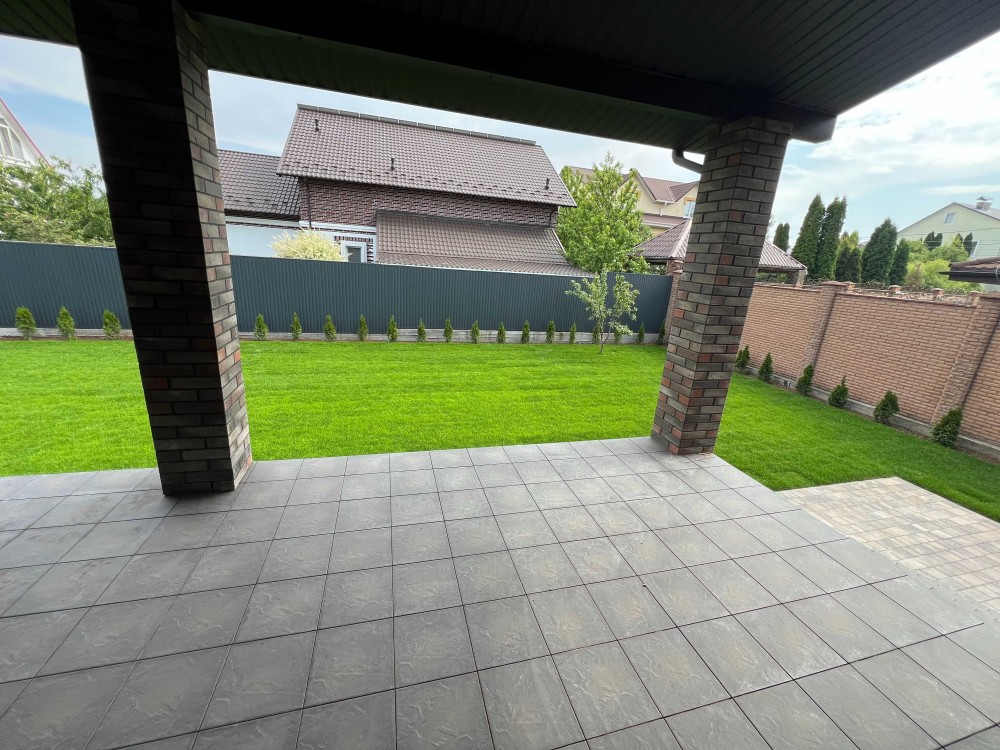 Підбетонка, тротуарна плитка, чорнозем, газон, озеленення, автополив