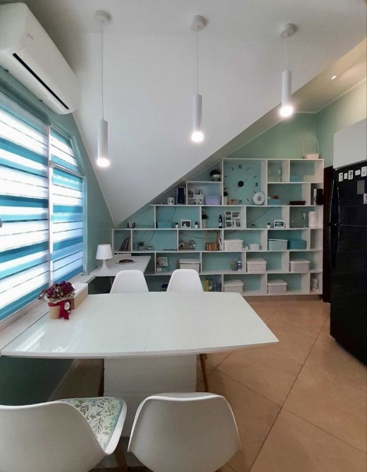 Був розроблений другий рівень квартири, де розмістилися ряд необхідних функціональних зон : двоспальне місце з ТV зоною, робоче місце, велике місце зберігання речей, лаунж зона з гамаком та допоміжним столиком,