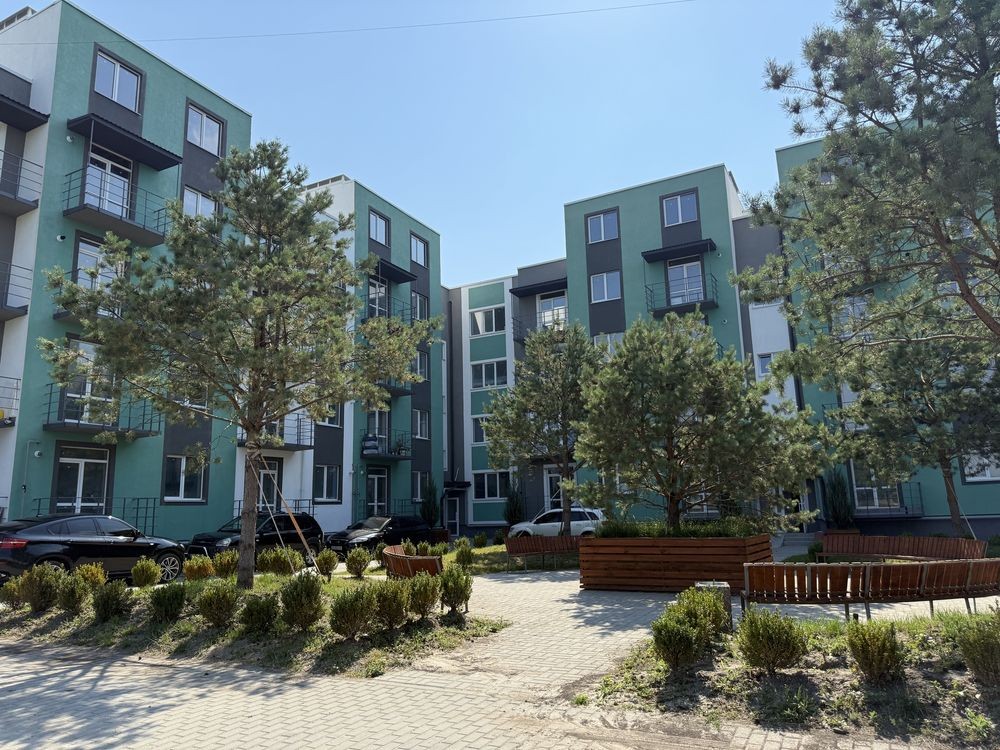 Сучасна архітектура, яскраві фасади, закрита територія. Пішохідні двори, парк у центрі комплексу з літнім кафе та зоною відпочинку брукованою паркетною дошкою з підвісними гойдалками-коконами.