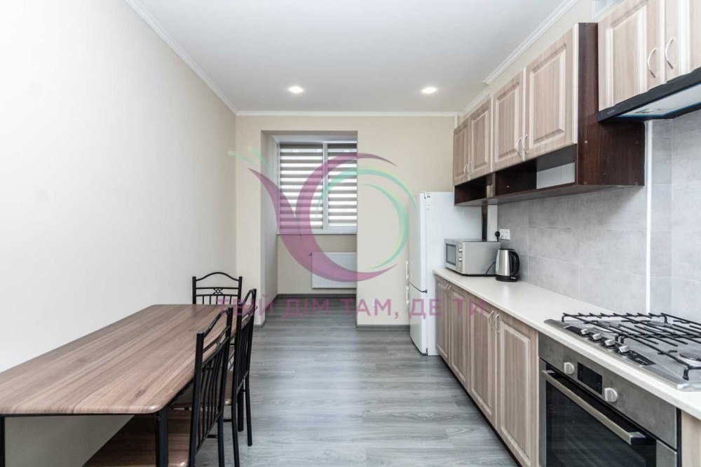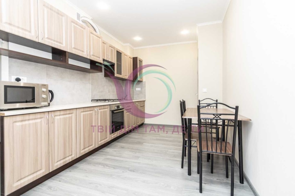 Кухня обладнана шафами для посуду, холодильником, плитою, мікрохвильовою піччю, вентиляцією, електрочайником тощо. А також має зручну обідню зону і вхід на засклену лоджію.