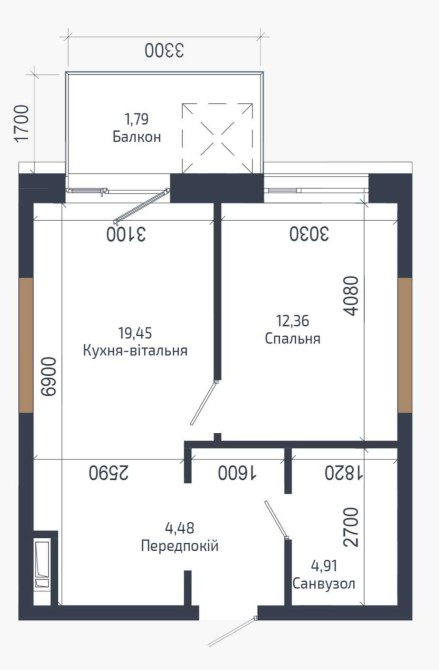 Планування: спальня 12,4 м²., кухня-вітальня 19,5 м²., балкон 1,8 м²., санвузол 4,9 м² та коридор 4,5 м².