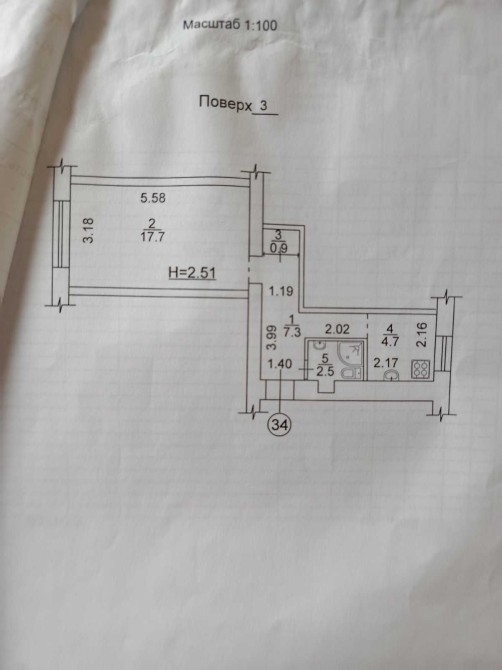 Квартира знаходиться на 3-му поверсі 5-ти поверхового будинку, загальна площа – 33м2,