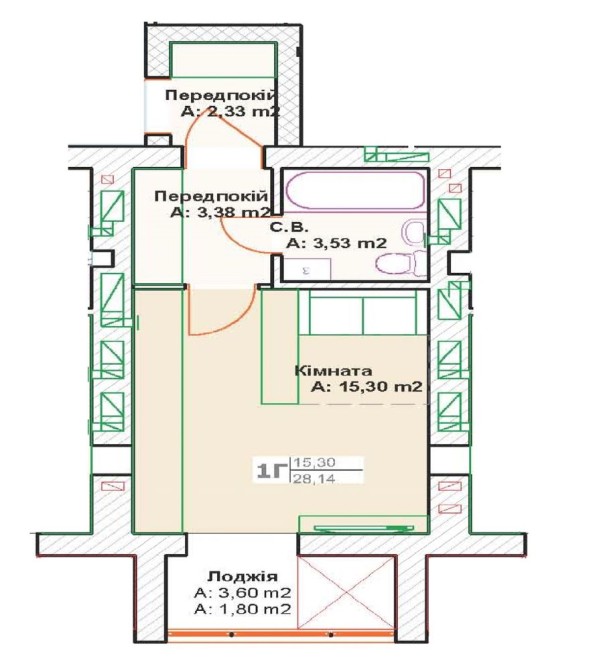 Загальна площа квартири: 27,68 м2