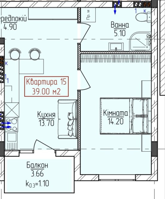 • Общая площадь 39 м2