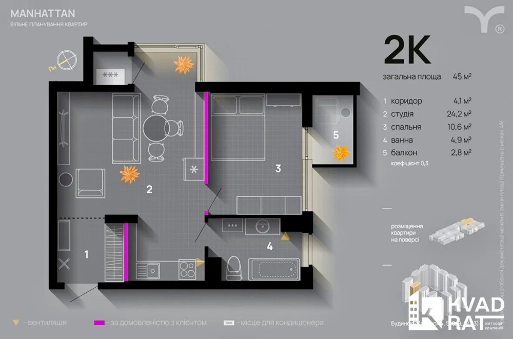 Простора 1-кімнатна квартира площею 45 м2, розташована на 5 поверсі. Зручне планування: велика кухня-студія та окрема спальня з виходом на балкон, що виходить у внутрішній двір. Санвузол просторий, з власним вікном.