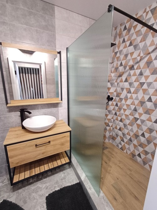 Санвузол сумісний, у світло-сірих тонах з мінімалістичною текстурою дерева. Підвісна сантехніка, підсвітка дзеркала, душова зона. Встановлена пральна машинка.