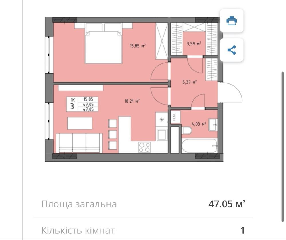 - Площа: 47м² – функціонально
