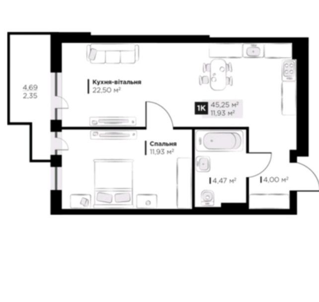 • Общая площадь 45 м2