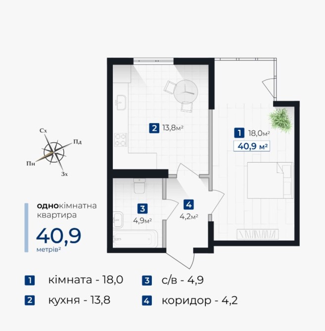 Площа квартири становить 40,9 м2!