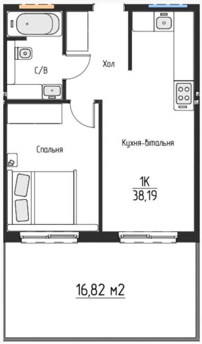 • Кімнат: 1 (спальня, кухня-вітальня, хол, санвузол)
