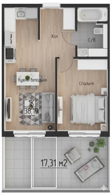 • Площа квартири: 38,19 м²