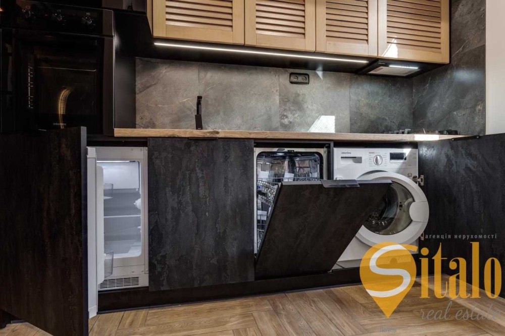 Квартира оснащена сучасною технікою : пральна машинка , сушарка, посудомийка , холодильник , мікрохвильовка , витяжка, духовка все під забудову. Максимально раціонально використаний простір. Високі стелі, три фасадних вікна на місто.