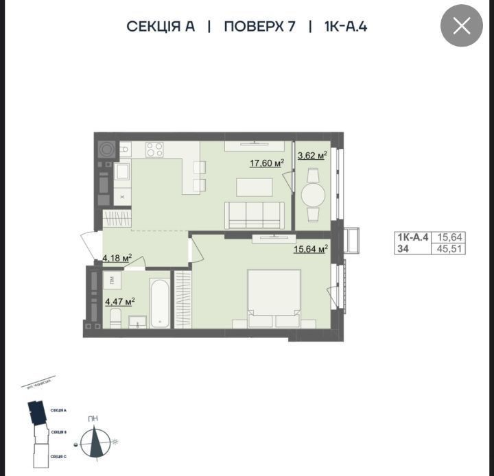 • Общая площадь 45.51 м2
