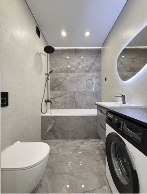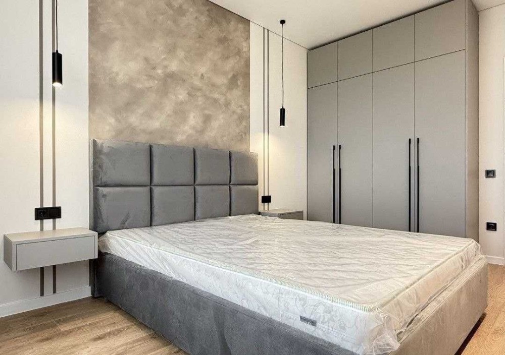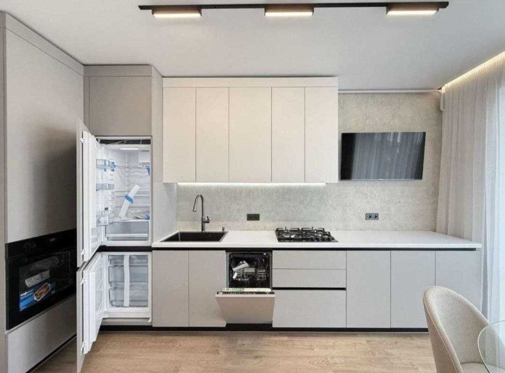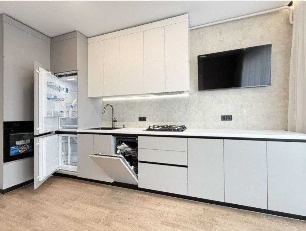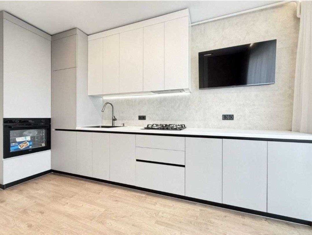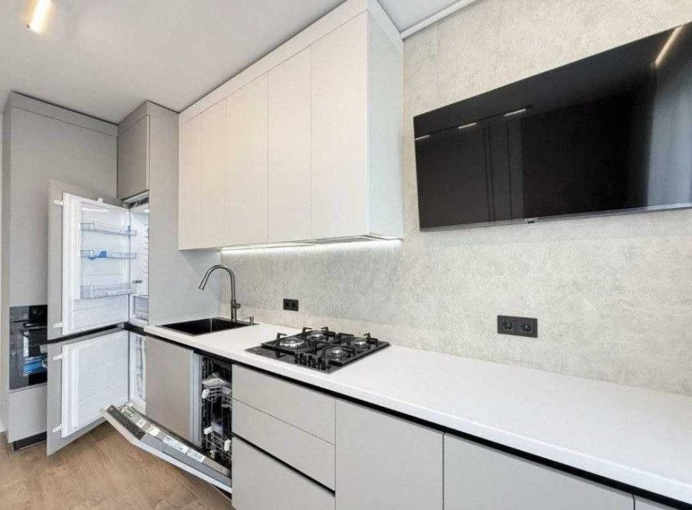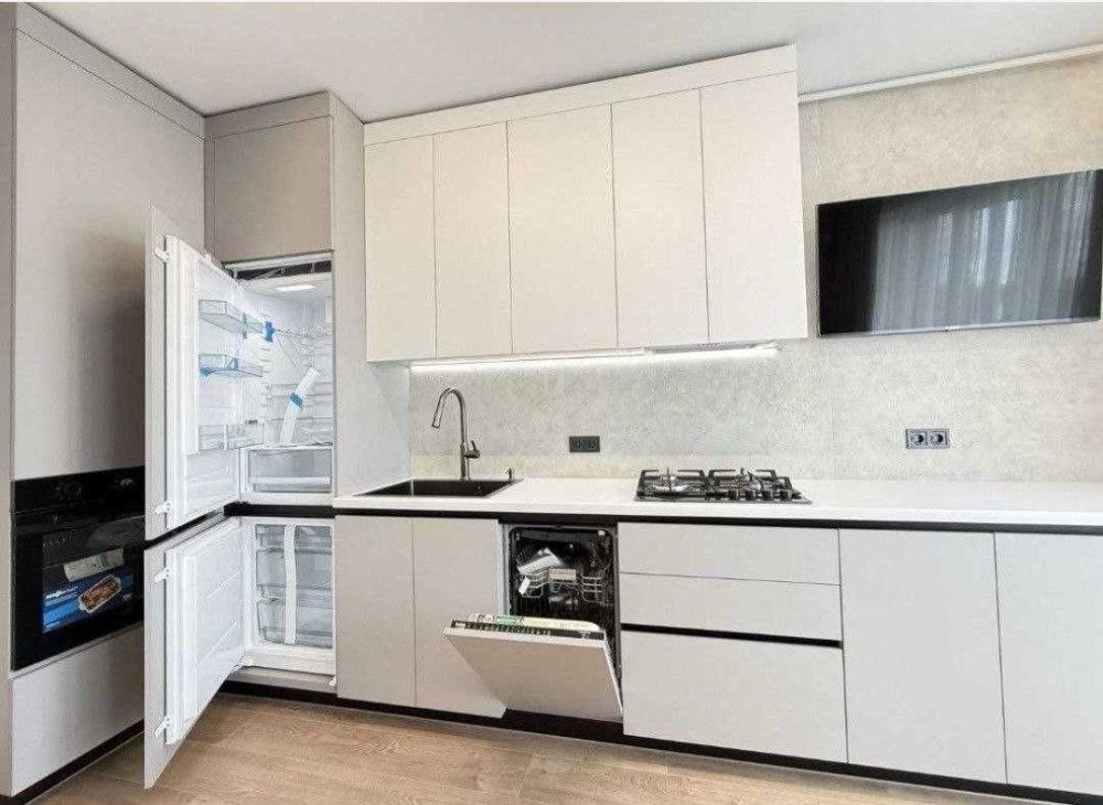Вбудована кухня з холодильником, духовою шафою, газовою поверхнею, посудомийною машиною. Телевізор. Кімната з двоспальним ліжком, шафою, Кондиціонер. Встановлена вся сантехніка, пральна машина, підігрів підлоги в санвузлі.