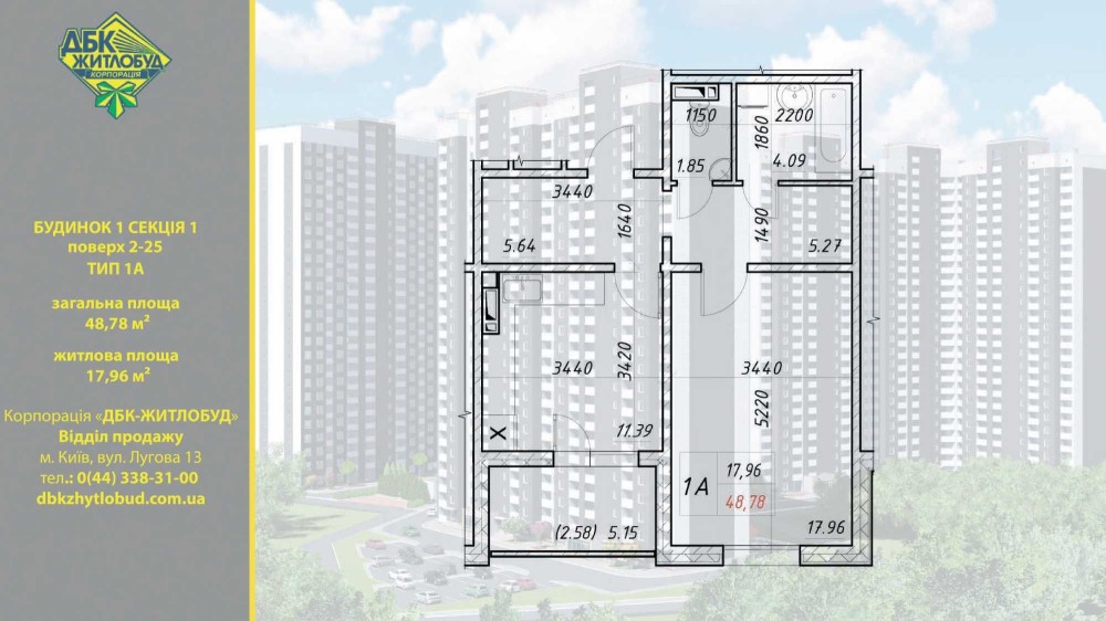 Площа: 48.79 ,кімната 18 і кухня 12.