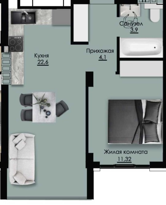 Общая площадь 42 кв.м, просторная кухня-студия 22 кв.м.