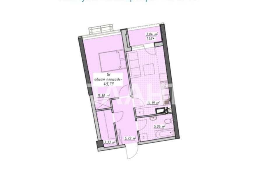 Квартира расположена на 5-м этаже. Общая площадь — 45 м², из которых 15 м² — комната и 15 м² — кухня. Формат планировки отлично подходит как для проживания, так и для аренды.
