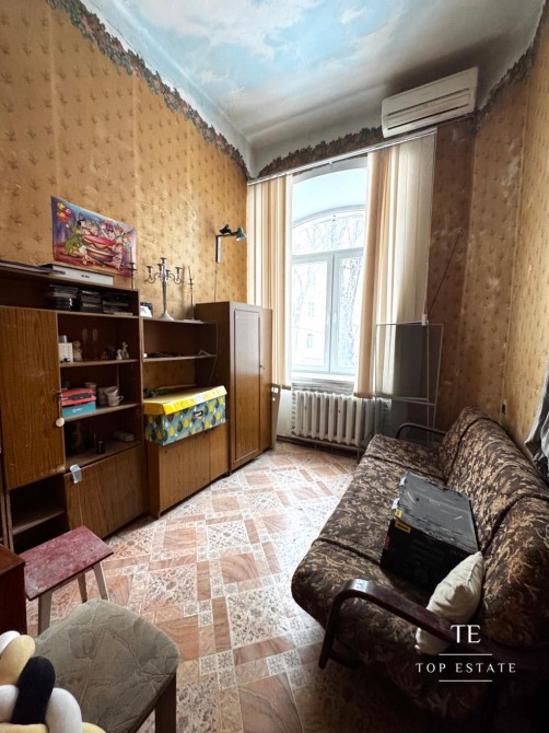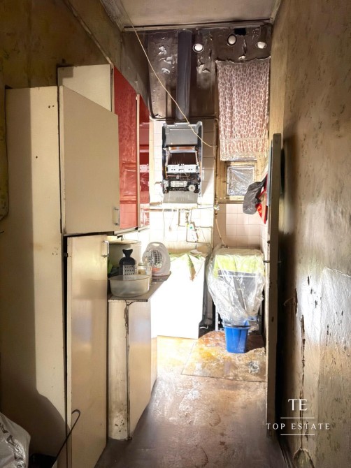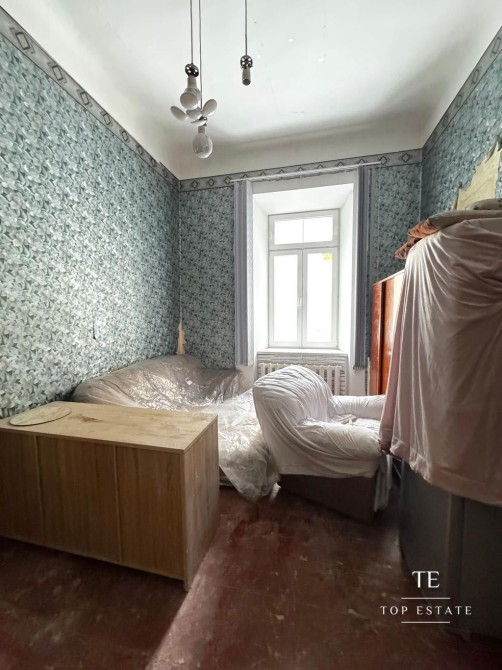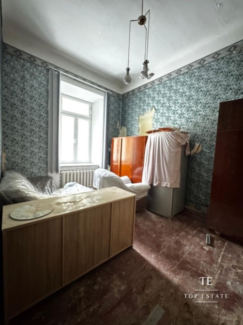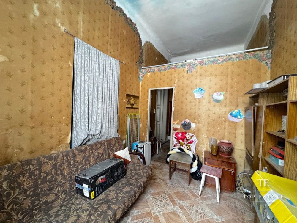 Квартира, яка потребує повного ремонту, складається з передпокою, вітальні з міні-кухнею, спальні та суміжним санвузлом.