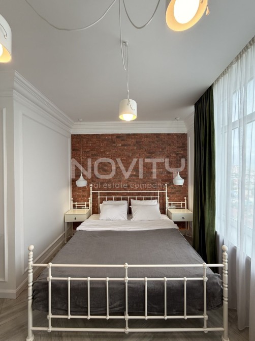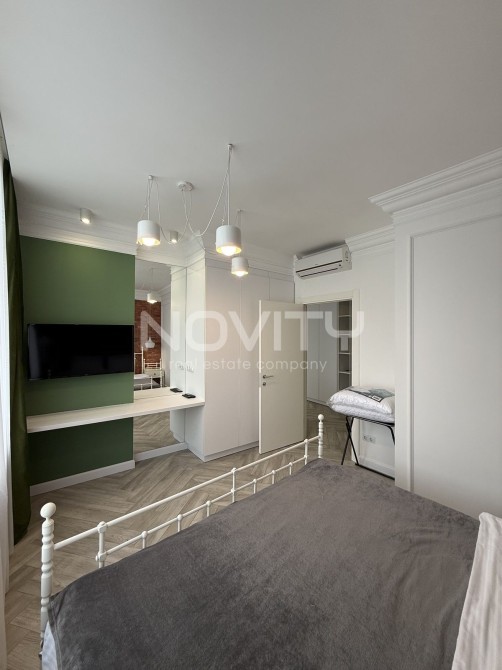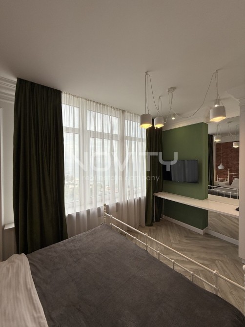 У спальні : велике ліжко, телевізор Смарт ТВ і кондиціонер. Кухня - студія : повністю укомплектована вбудованими меблями і технікою, а саме, холодильник, витяжка, мікрохвильова піч, духова шафа, обідня зона, телевізор і диван, що розкладається.