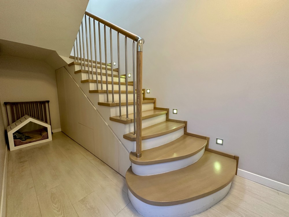 Вінілова підлога на першому поверсі та паркетна дошка (ясень) на другому поверсі. Сходи - моноліт, обробка ясень.