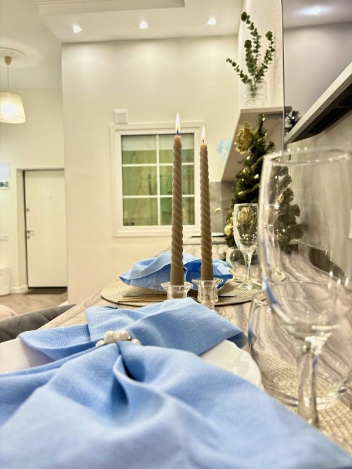 Современная кухня: Полностью оборудована всем необходимым для приготовления пищи, включая холодильник, микроволновку, варочную поверхность, а также умный электрочайник с возможностью подогрева воды до определенной температуры, для приготовления горячих напитков, а также стиральная машина.