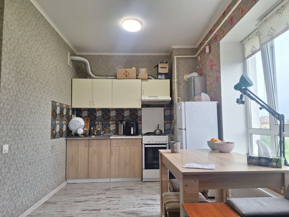 Квартира УКОМПЛЕКТОВАНА меблями та ТЕХНІКОЮ. Опалюється двохконтурним газовим котлом. Панорамні красиві вікна в квартирі та на лоджії. Кімната 17 м , санвузол 5 м, великий квадратний передпокій та кухня 13м поєднані та зонована на робочу та столову зони.