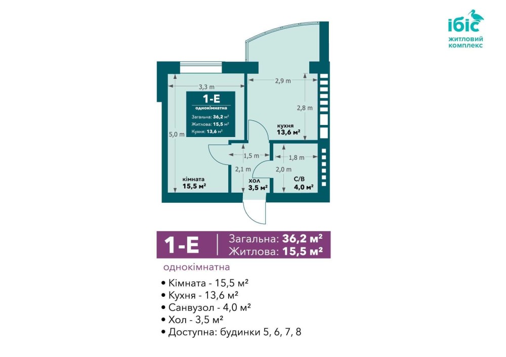 • Общая площадь 36 м2