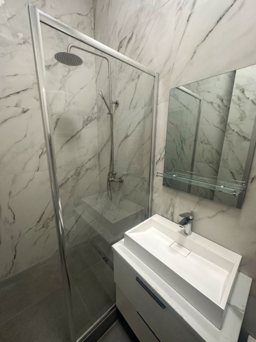 Сучасна ванна кімната з душовою кабіною, пральною машиною-автомат та бойлером.