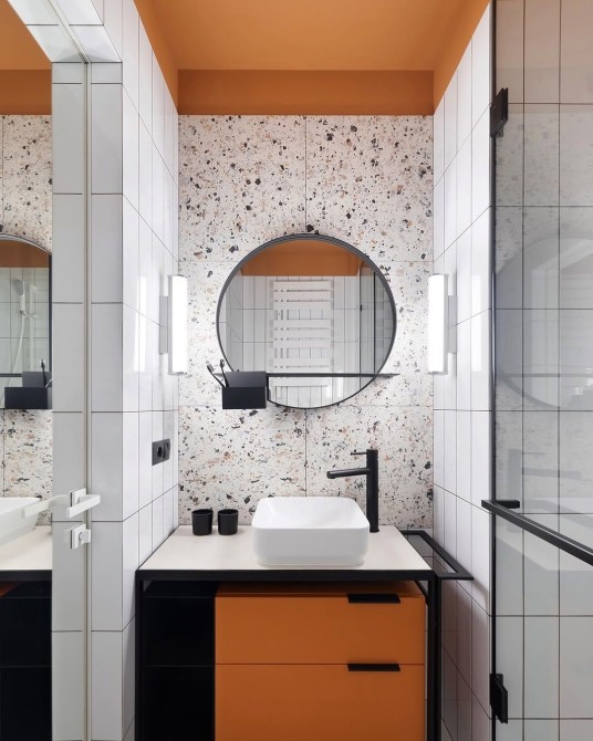 Стильна ванна кімната з walk-in душем, террацо-акцентами та сучасною сантехнікою