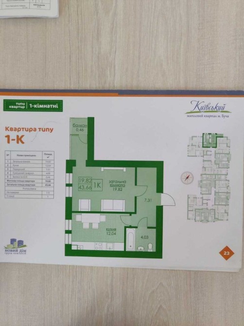 Площа 44м2,кухня студія 25м2