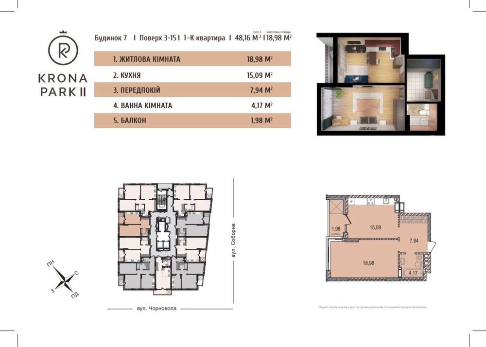 Загальна площа — 48,2 м², житлова — 19 м². Кухня має площу 15,09 м², окрема кімната — 19 м², з видом на ліс і приватний сектор.