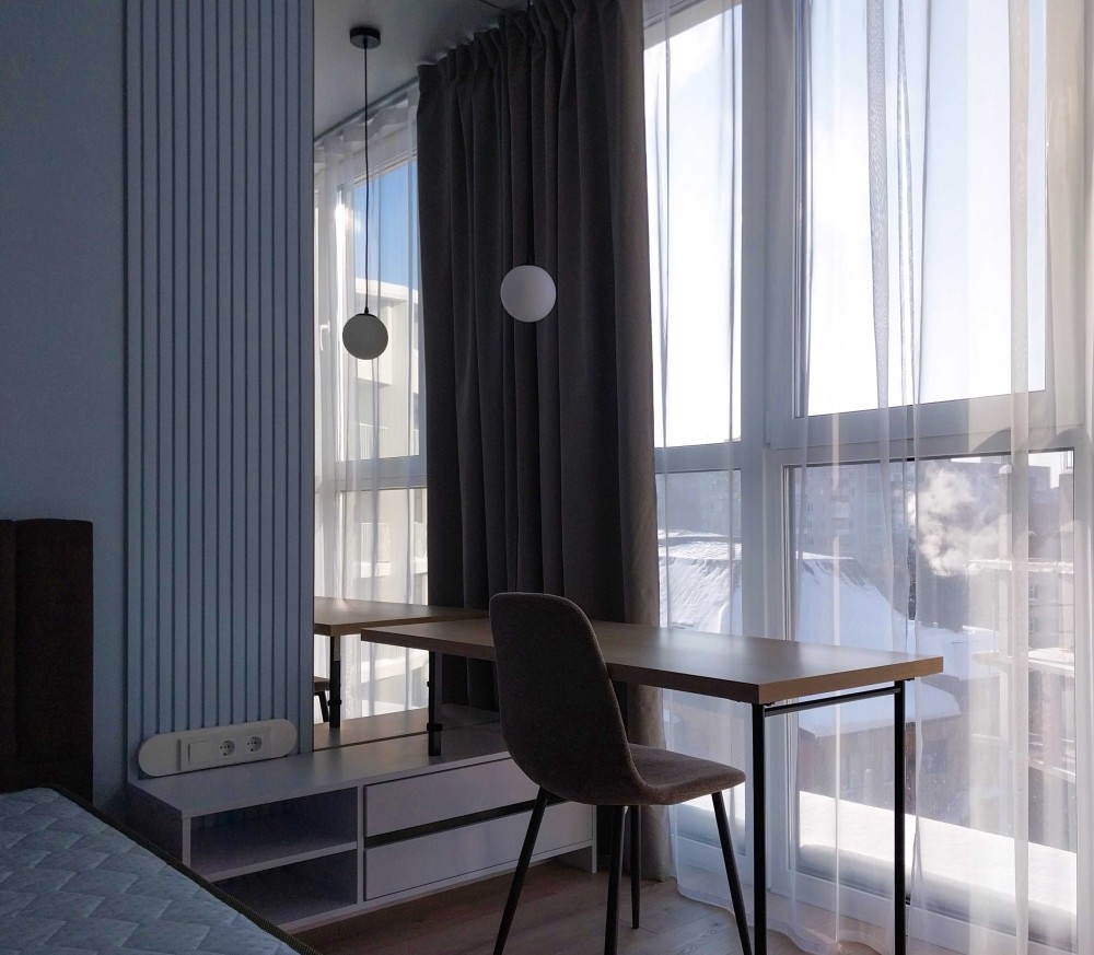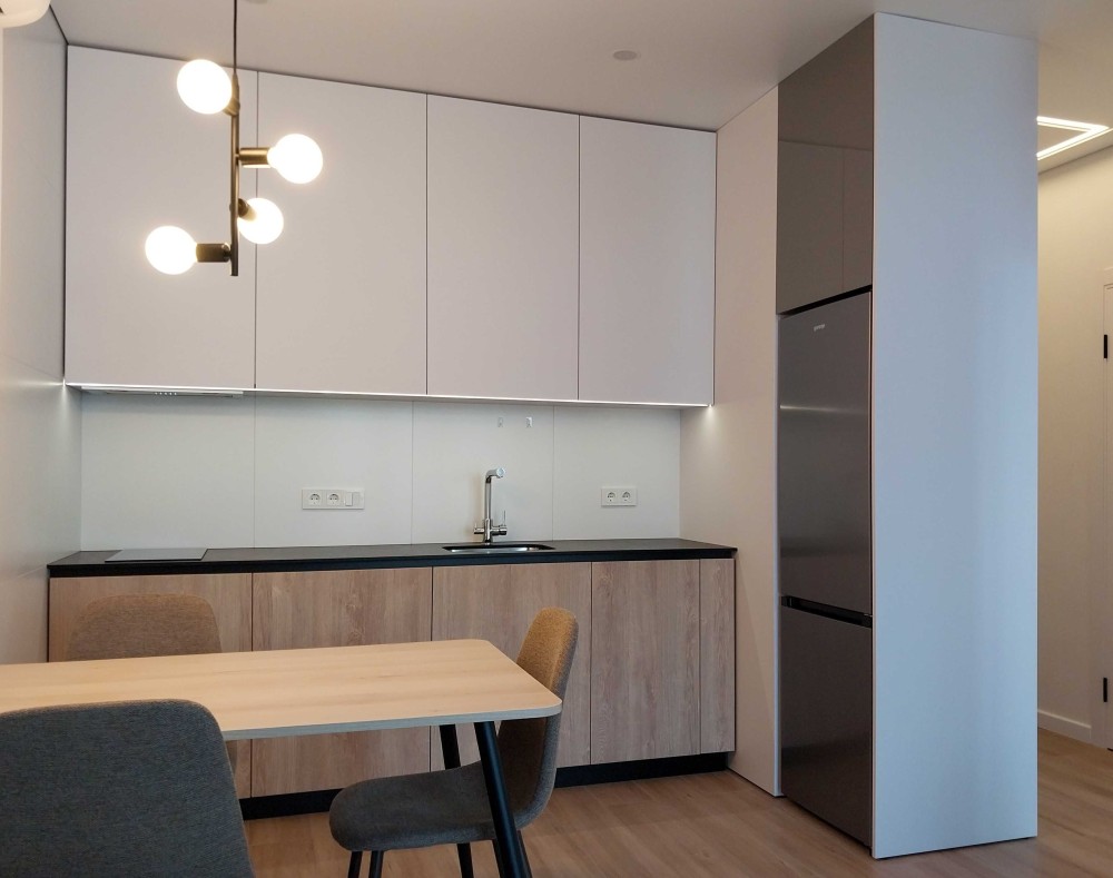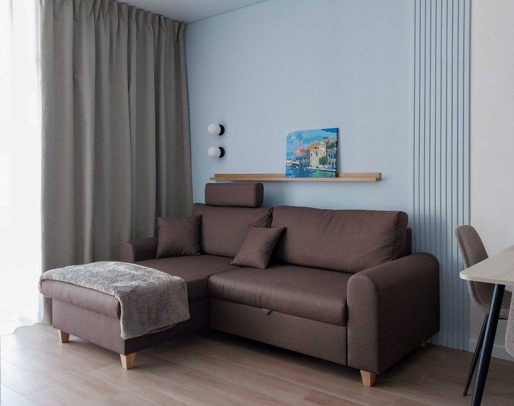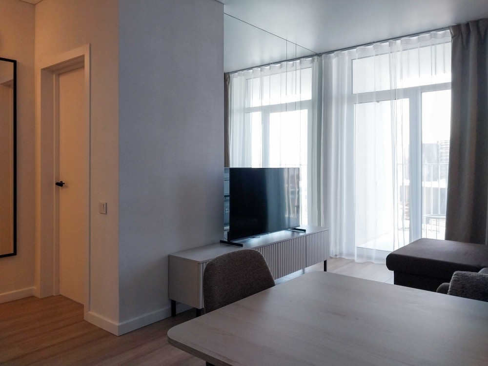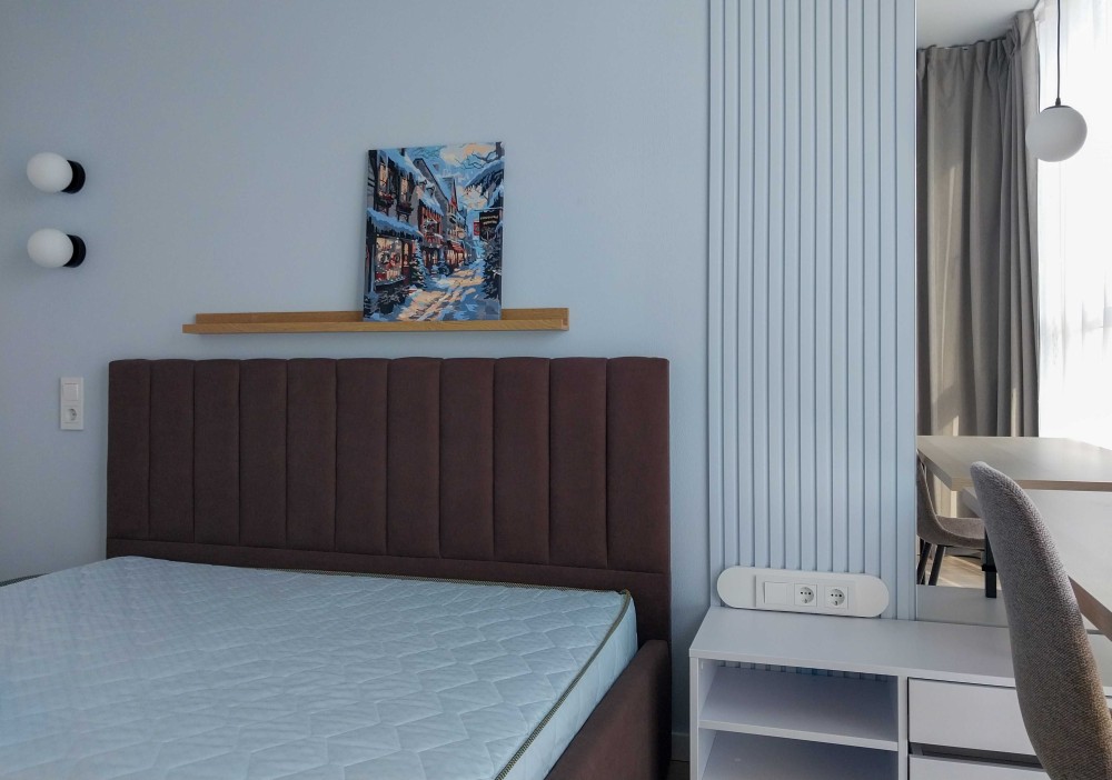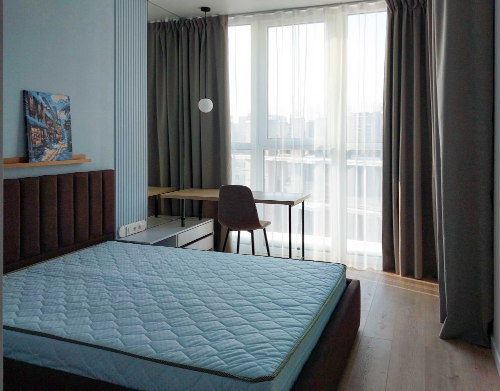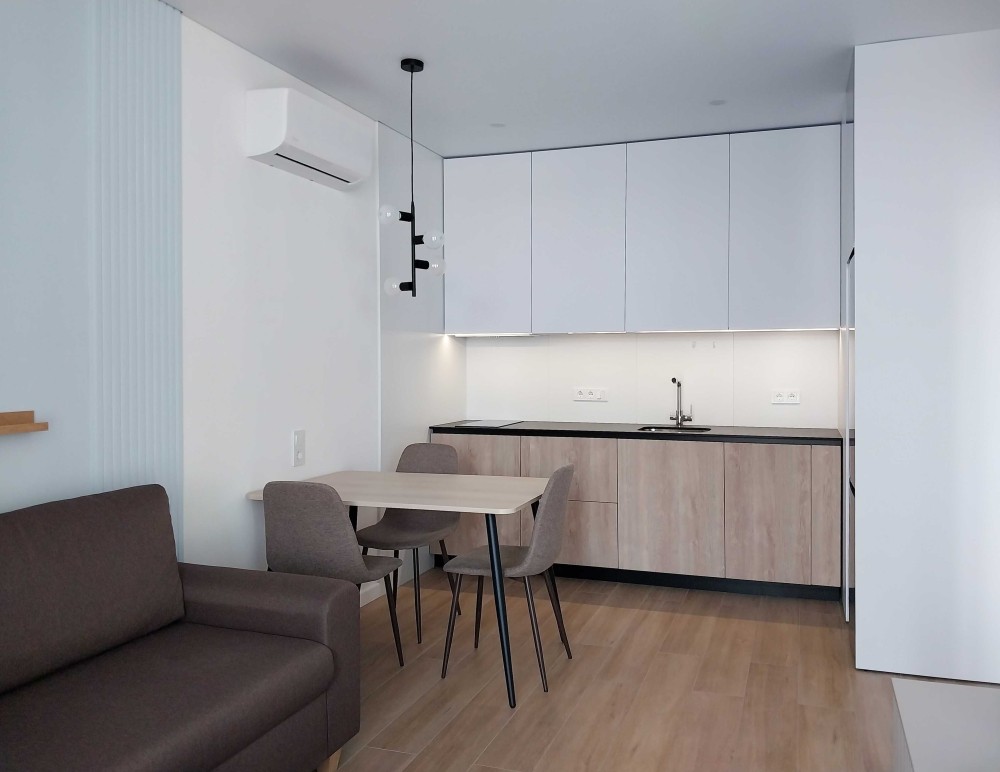 Квартира світла, з лоджією, сучасний ремонт (перша здача), площа - 40 кв.м. Укомплектована технікою та меблями. Без духовки. Диван розкладний. Ліжко односпальне, ортопедичний матрац (160х200см). Великий робочий стіл (140х60см)