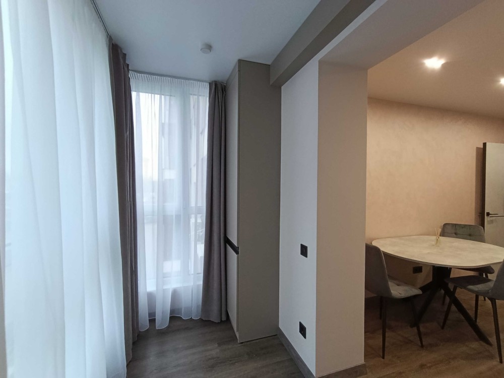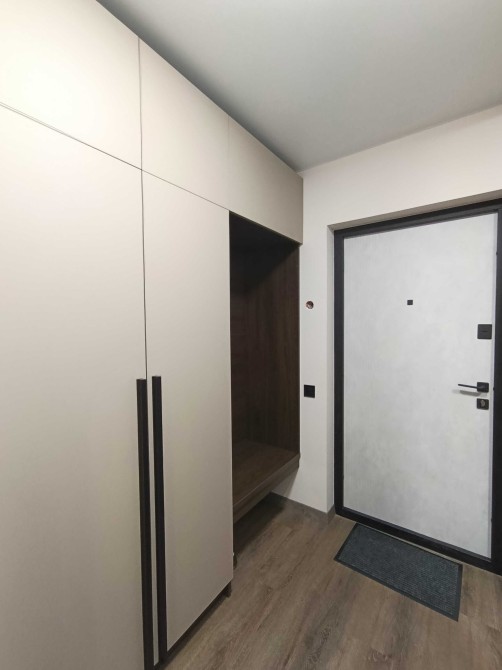 Має зручне планування: прихожа з вбудованою шафою, санвузол з душовою кабіною, у просторій кухні-студії розмістився стіл з стільцями, та влізе щє й диван. Спальня кімната з окремим гардеробом.