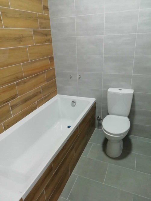 Облаштовано кухонна зона плиточкою. У санвузлі є вана та туалет. Сучасне облицювання.