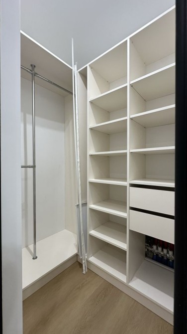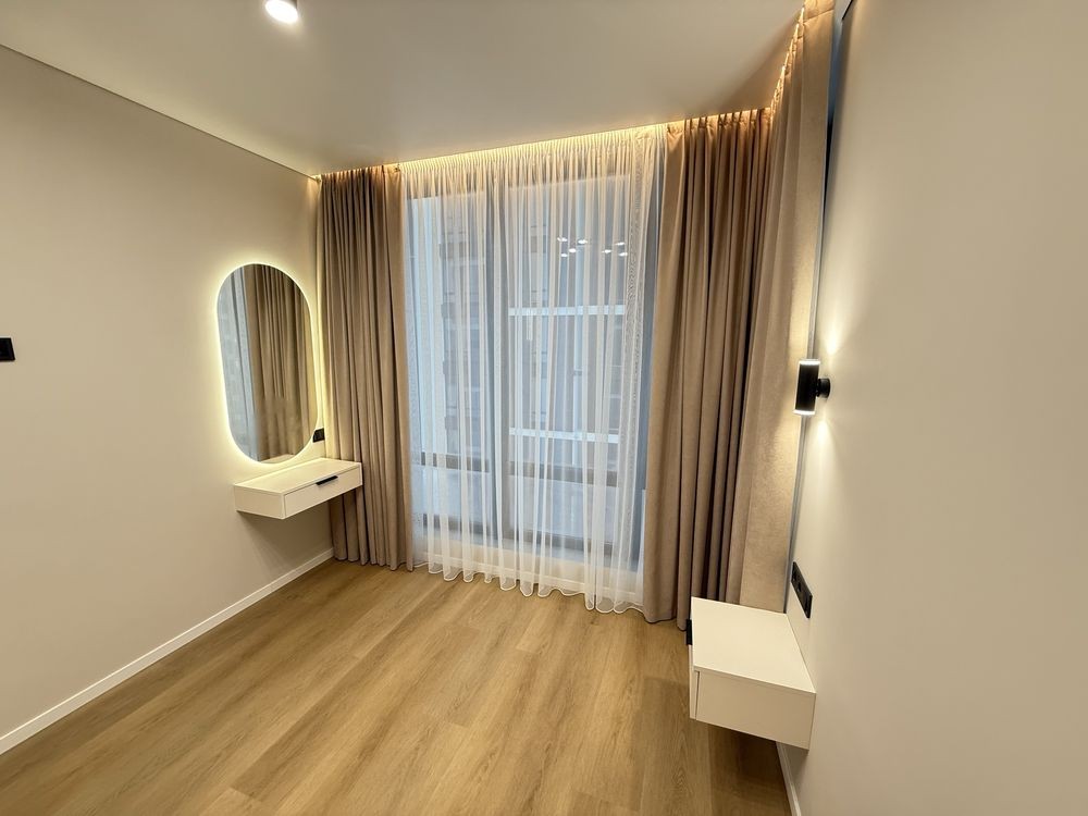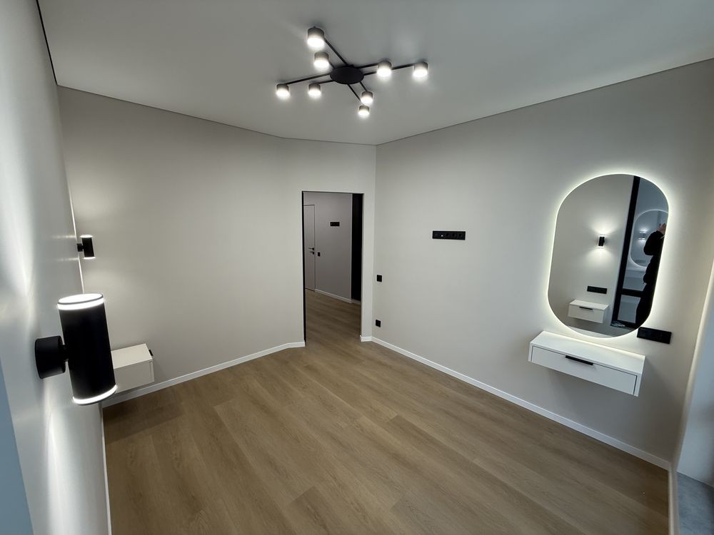 У спальні — стильні підвісні тумби та окрема бʼюті-зона. У прихожій — дзеркало у повний ріст із підсвіткою.
