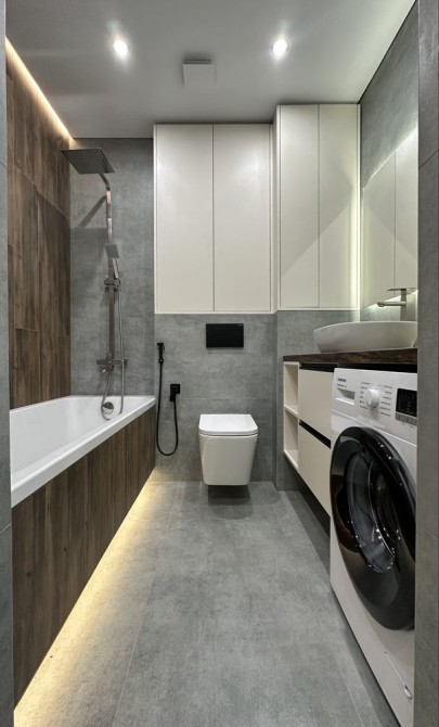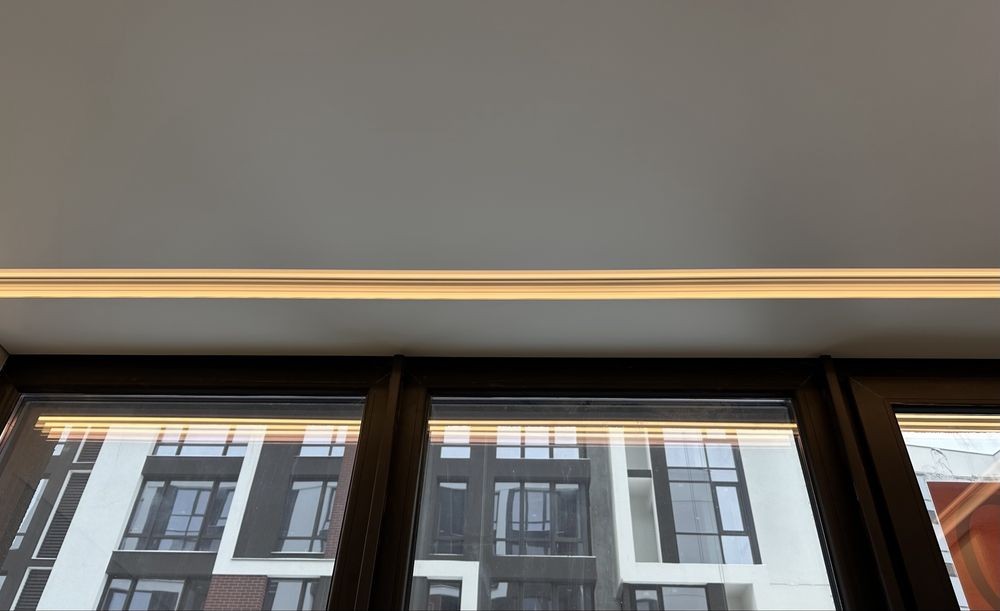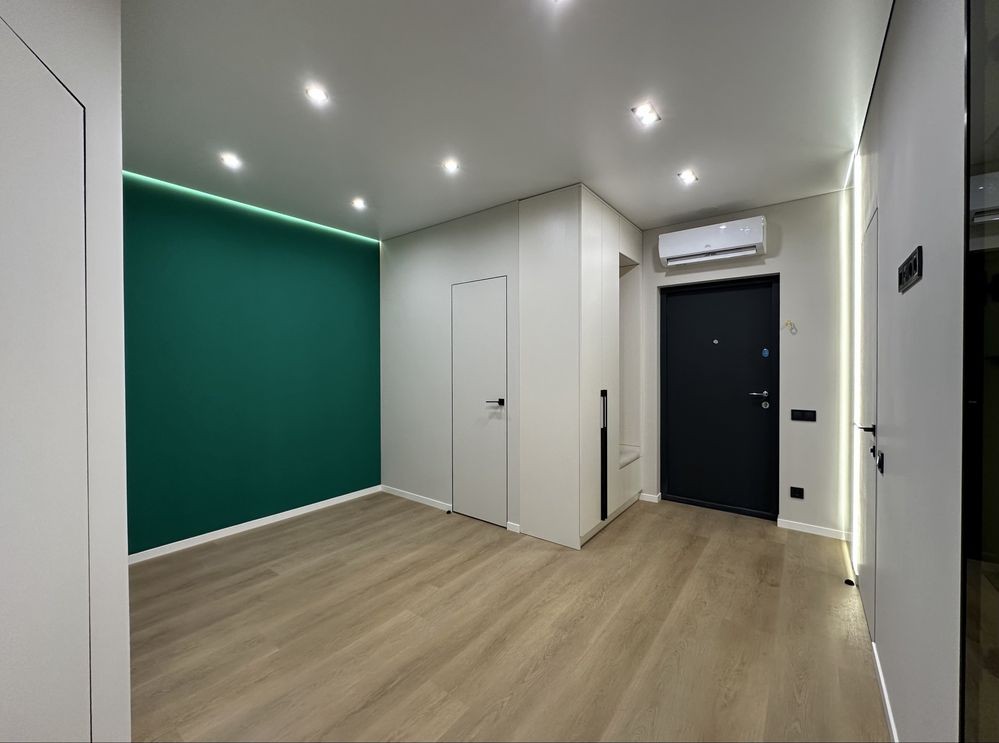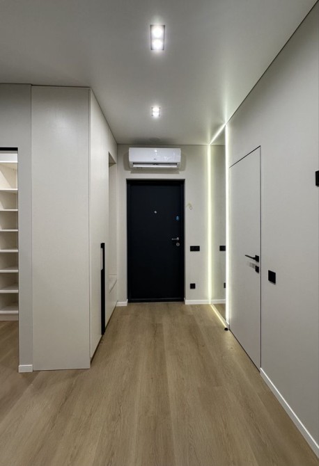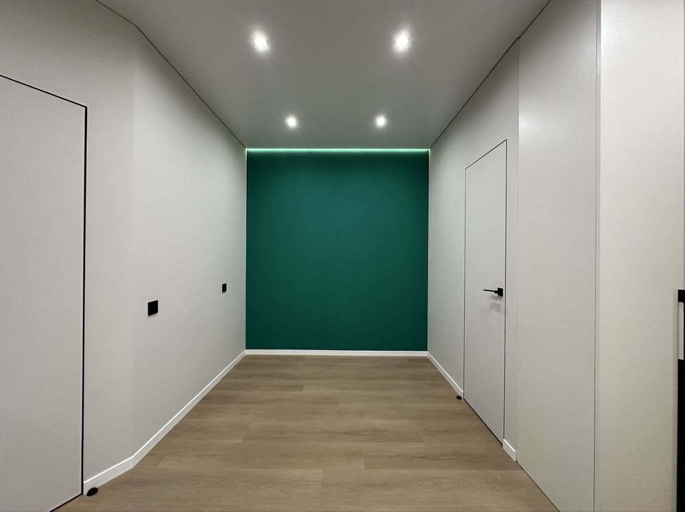 Підвісна стеля з тіньовим профілем, вмонтовані карнізи з підсвіткою створюють сучасний та елегантний інтерʼєр. Двері прихованого монтажу підкреслюють мінімалістичний стиль квартири.