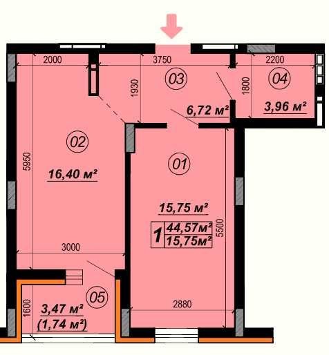 Площа 44,57м2