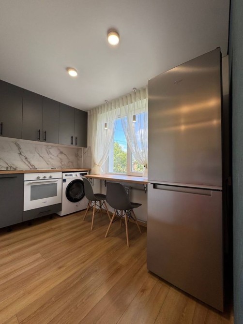 Сучасна і простора кухня із вбудованою пральною машиною Samsung, економить місце і залишається практичною. Холодильник винесений в коридор, а на його місті інстальована барна стільниця обʼєднуюча вітальню і кухню. Проходи розширено і знаходитись зручно. А замість підвіконня, інстальована стільниця, імітуючи кухонний стіл. Якісна, з товстого металу мийка із вбудованим дозатором мила. Сучасний холодильник BEKO 1,80м. Газова варильна поверхня ARDESTO із газ контролем. Вбудована електрична духова шафа ARDESTO. Новий лічильник газу схований в меблях кухні.