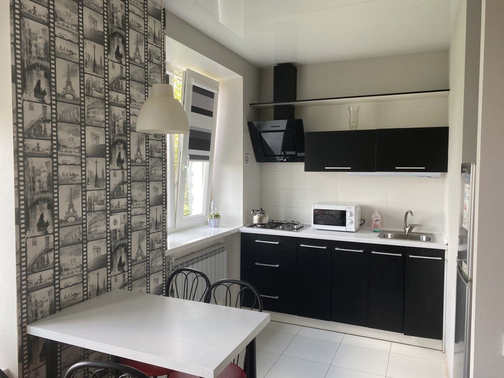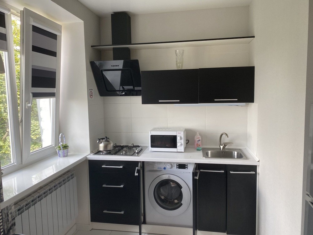 Кухня: сучасна кухня, повністю обладнана для приготування їжі. Є плита, посуд, витяжка, мікрохвильова піч та достатньо місця для приготування та прийому їжі. Також на кухні додаткове спальне місце-розкладний двоспальний диван .