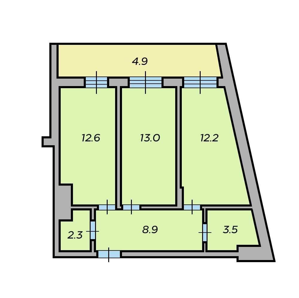 Планування: 2 спальні 12,2 м² та 13,0 м²., балкон 4,9 м²., кухня 12,6 м²., санвузол 3,5 м²., гардеробна 2,3 м² та коридор 8,9 м².