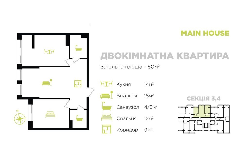 Секція 4 , поверх -9 . Площа 63,7м