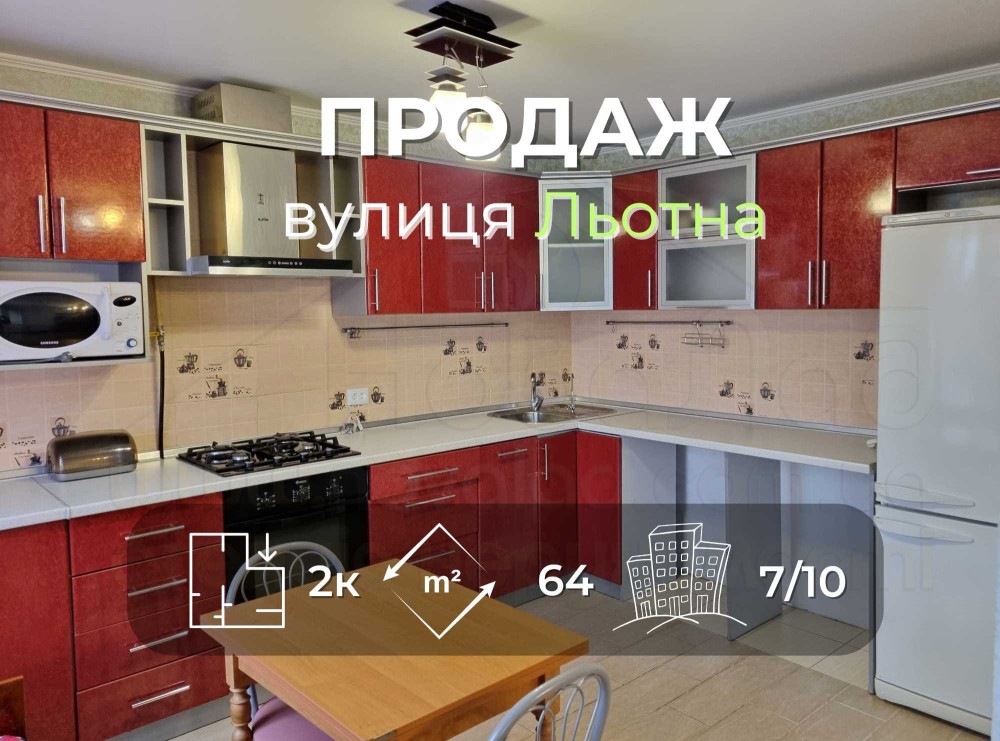 Квартира знаходиться на 7 поверсі 10-ти поверхового цегляного будинку. Загальна площа квартири 64 м2, кухня 10 м2. Не кутова. Стан квартири дозволяє заїхати і жити