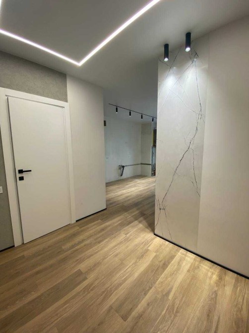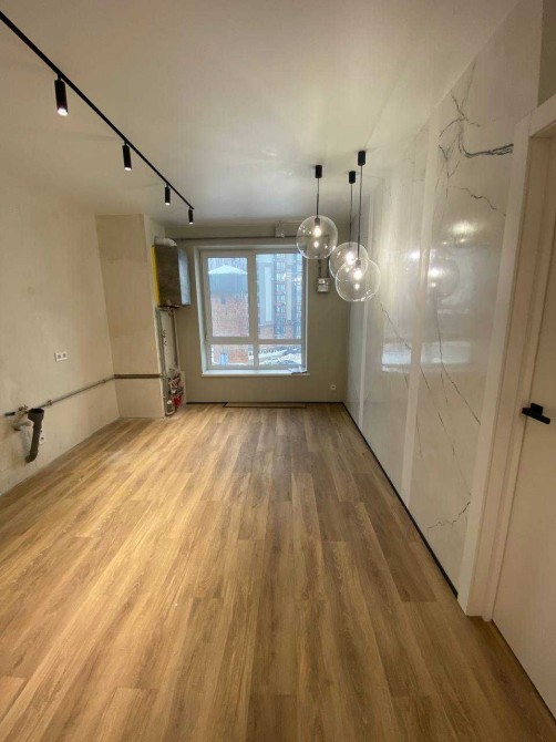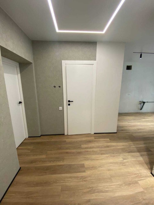 Підлога — вологостійкий вініловий ламінат під натуральне дерево: практично, красиво й сучасно. Це той випадок, коли квартира вже має характер і правильну основу для комфортного життя без зайвих витрат і переробок.