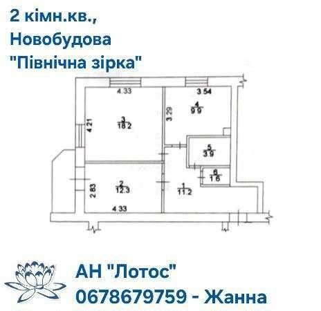 Загальна площа 58,3 м. кв., житлова – 30,5 м. кв. (18,2+12,3), площа кухні-їдальні – 9,9 м. кв.