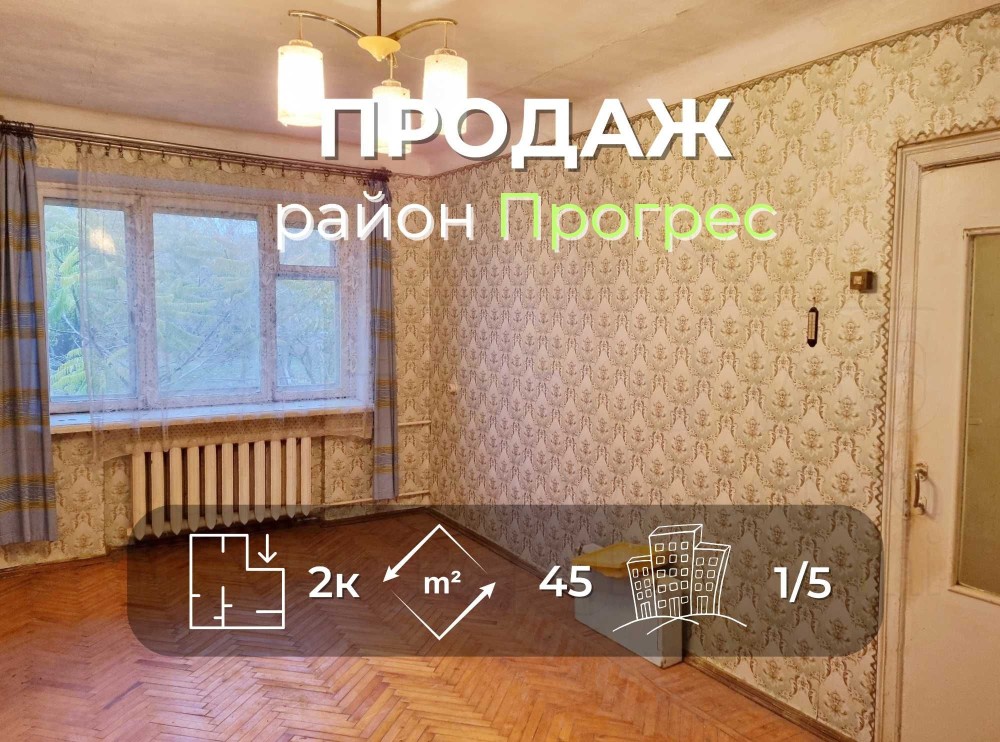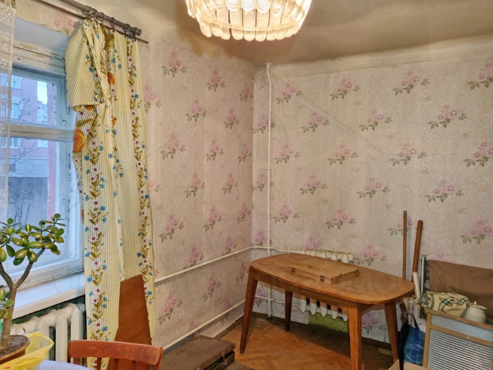 Квартира розташована на 1 поверсі 5-ти поверхового цегляного будинку. Загальна площа квартири 45 м2, кухня 6 м2. Стан квартири потребує ремонту