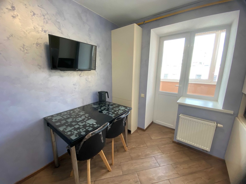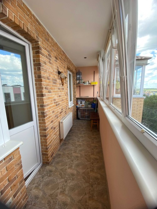 Планування квартири зручне та практичне, є великий балкон зі стелажами для зберігання речей.