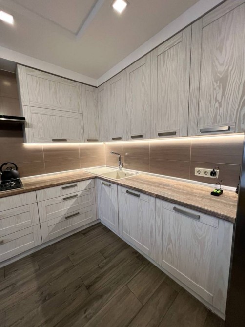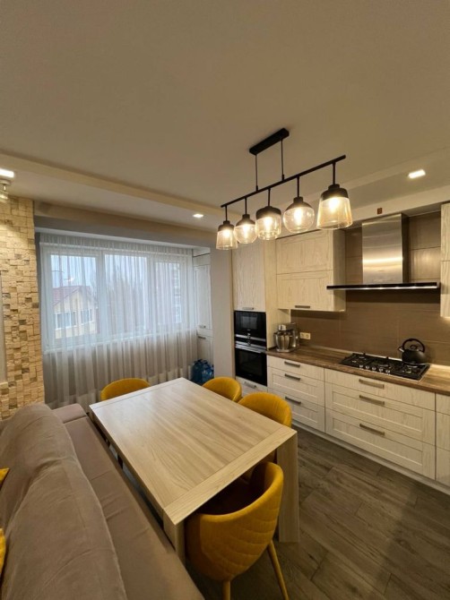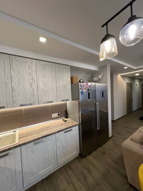 Квартира повністю укомплектована меблями та вбудованою технікою: духова шафа, варильна поверхня, витяжка, холодильник. Виконано якісний ремонт із використанням сучасних матеріалів. Підлога — керамограніт під дерево. Продумане багаторівневе освітлення.